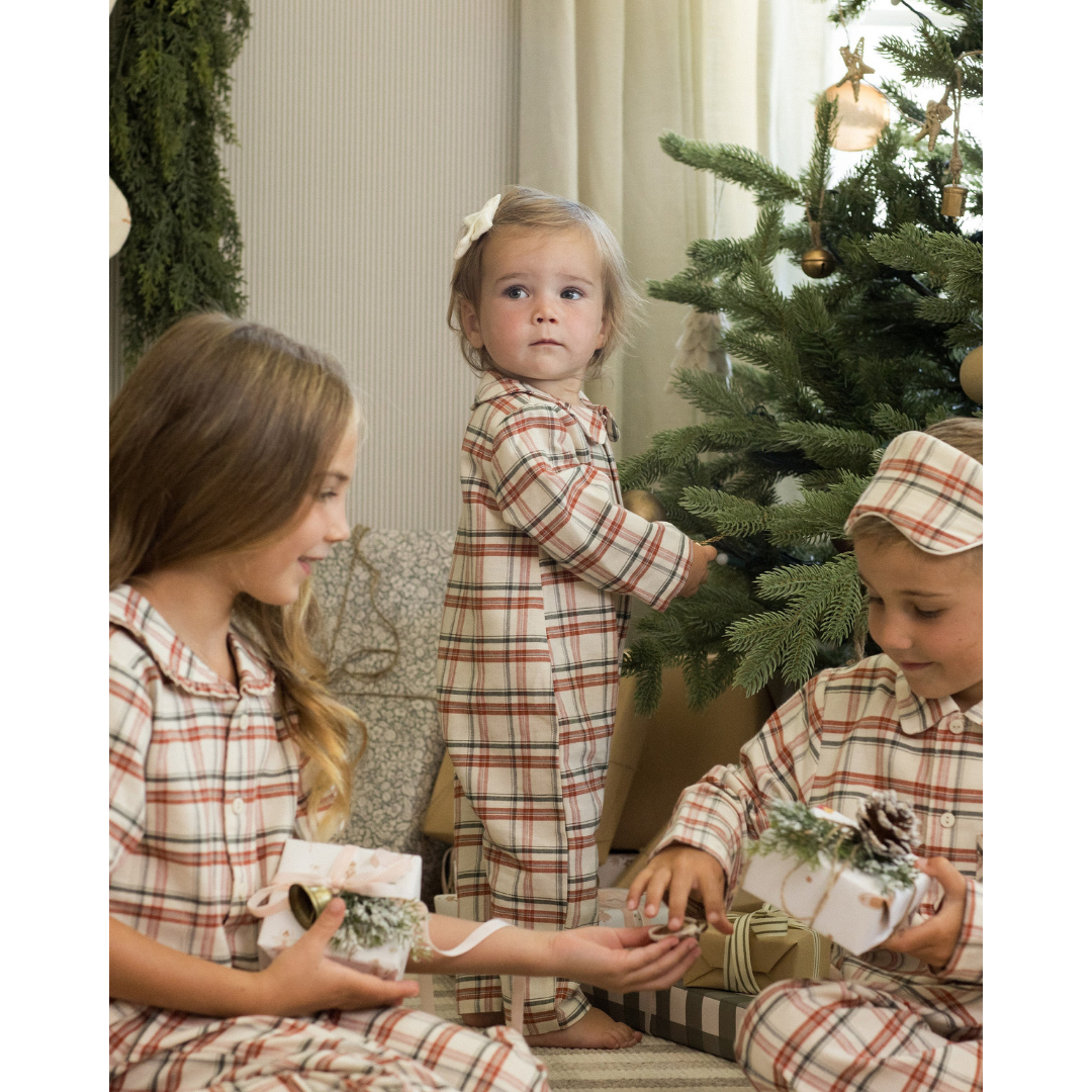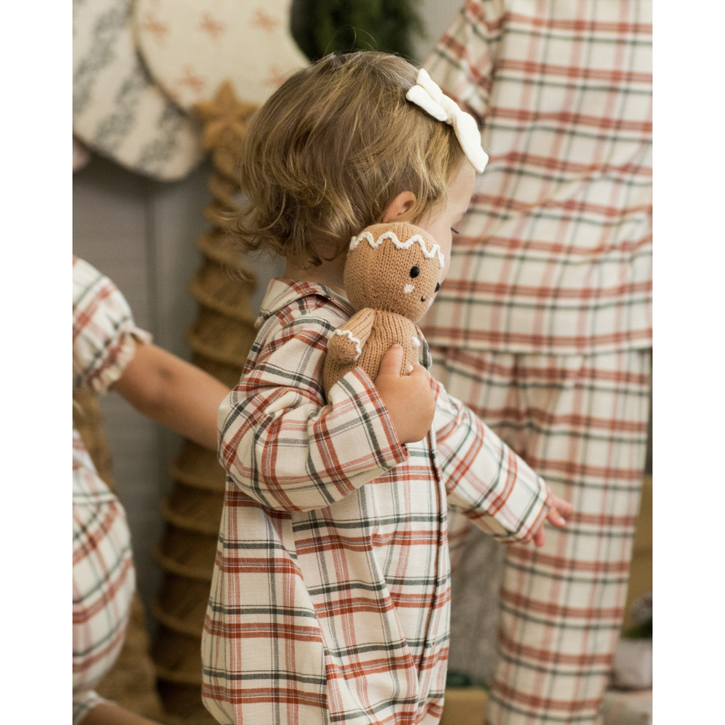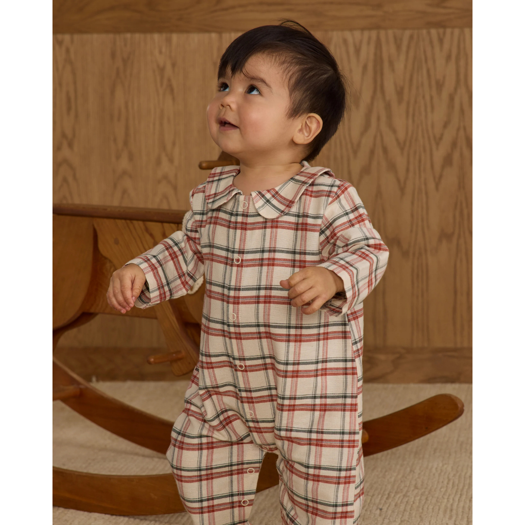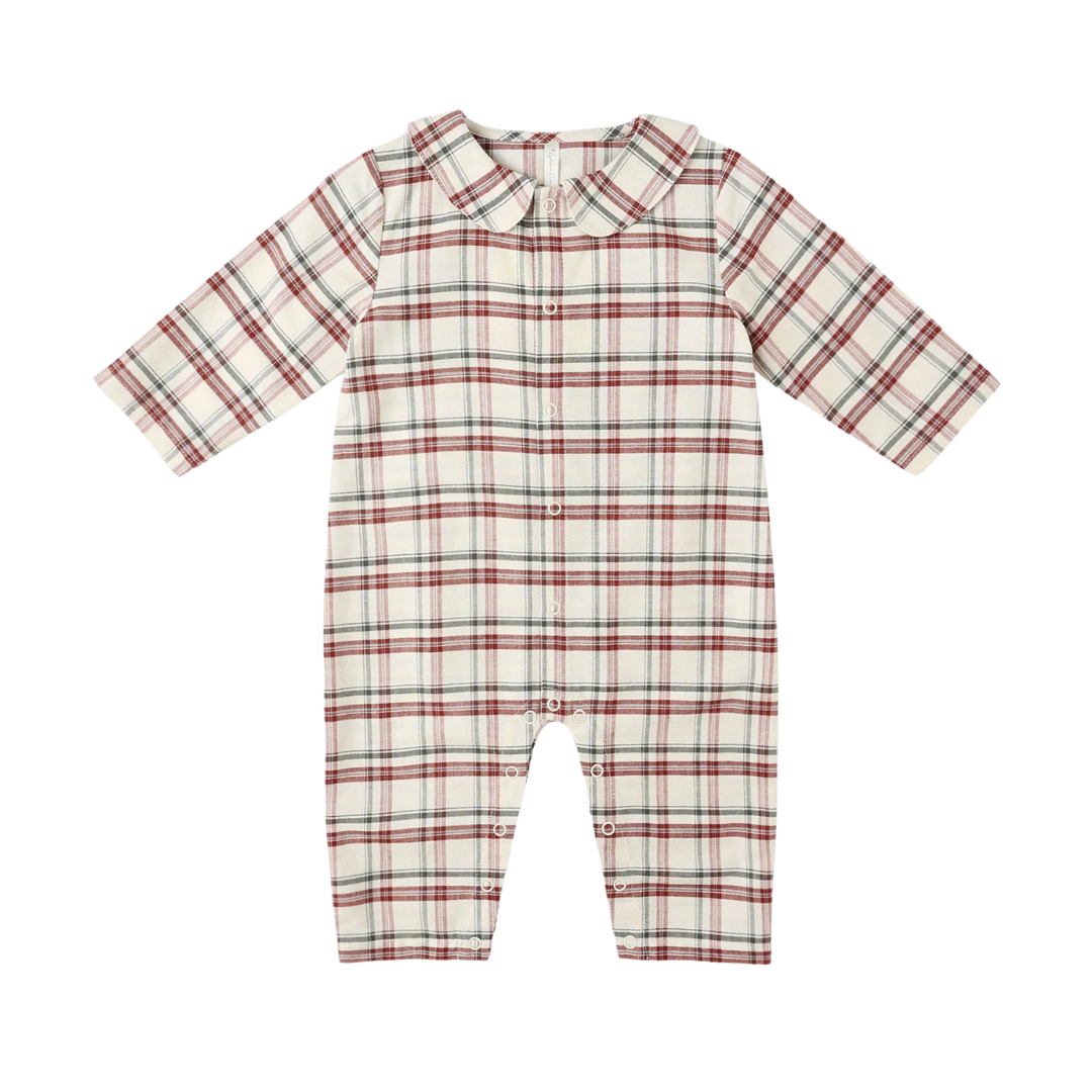 This longall has long sleeves and snap buttons along the center front and snaps at the inseam for easy changing. Featuring a 'holiday flannel' all-over pattern.