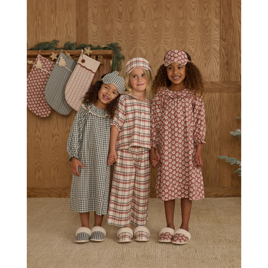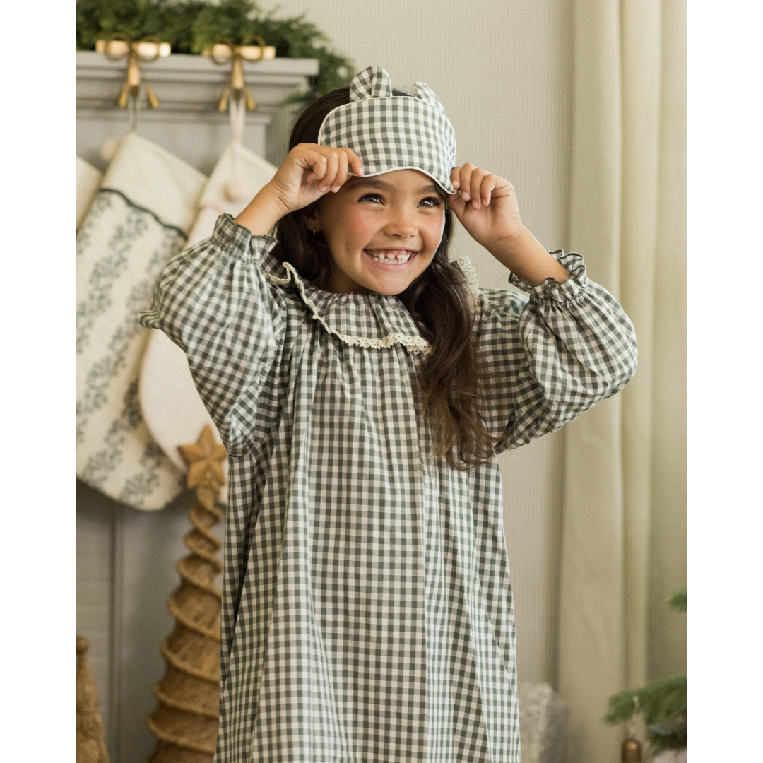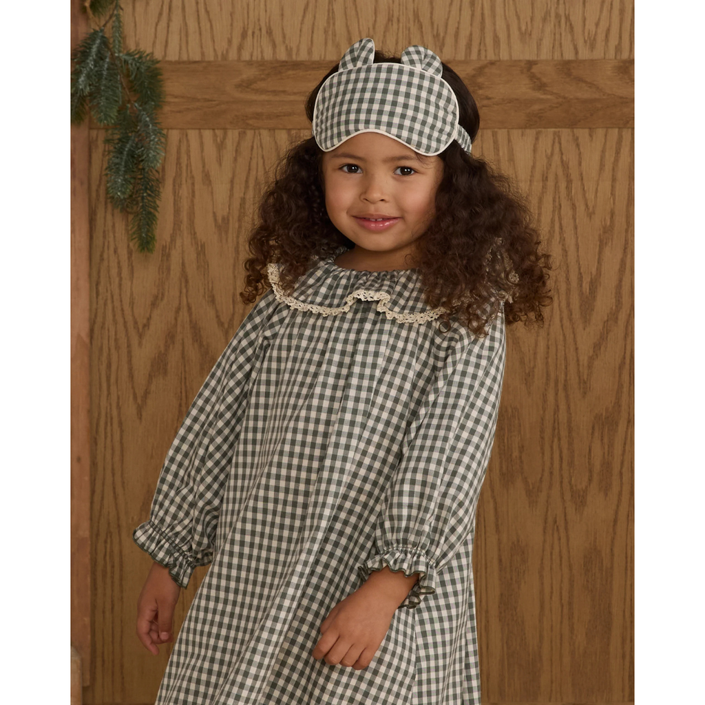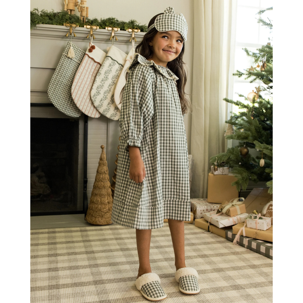 This gown has mid-length sleeves, and delicate ruffled collar. Featuring an 'evergreen gingham' all over print.