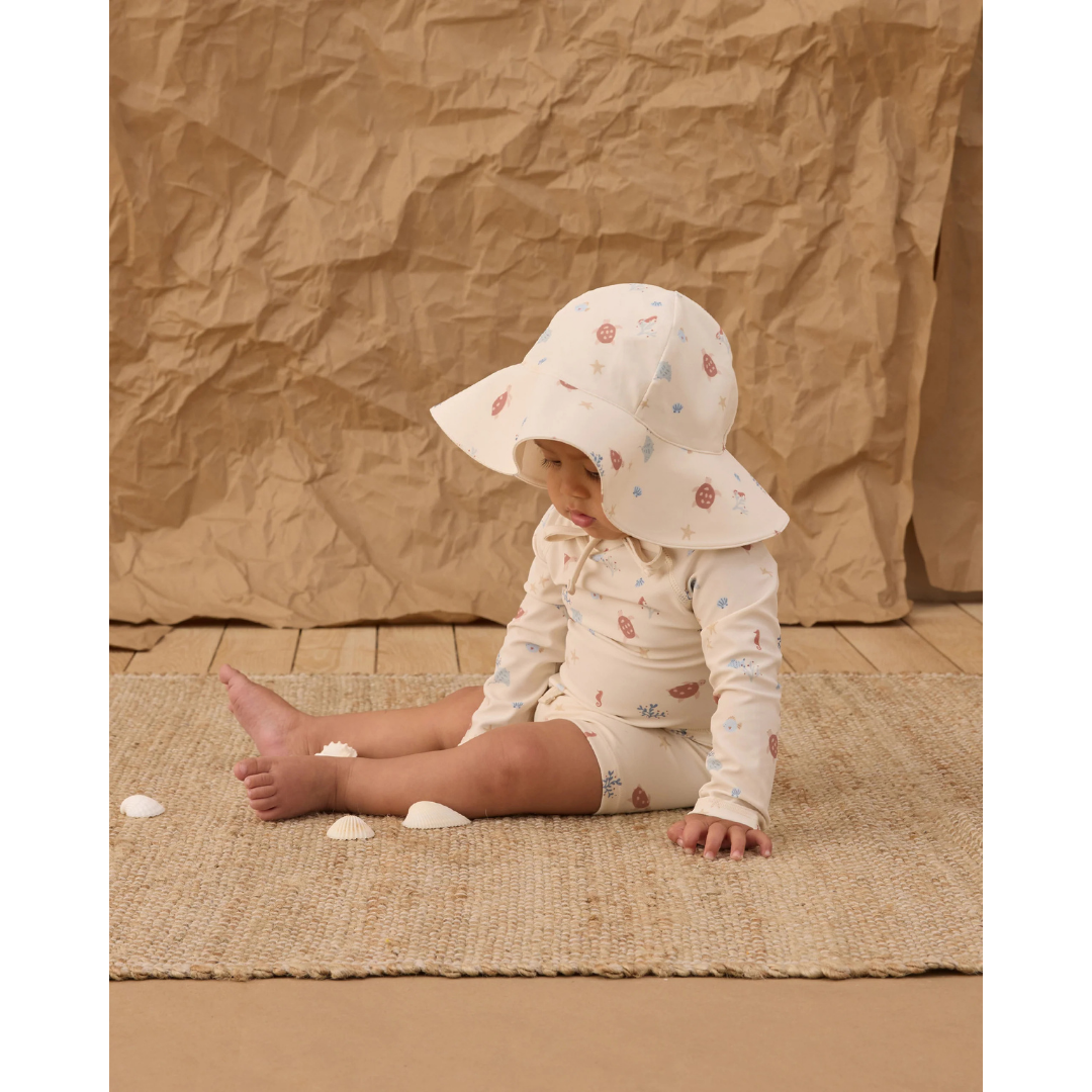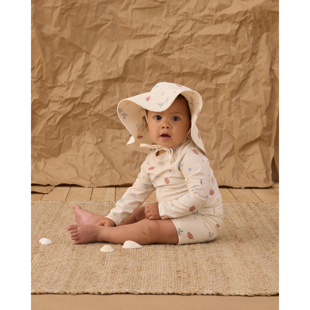 This two-piece rashguard set will have your little one protected from the sun in style. Featuring a long sleeve rashguard top and coordinating swim short bottoms with an adjustable drawstring. Add a pinch of fun to your wardrobe with this cute coastal print.
