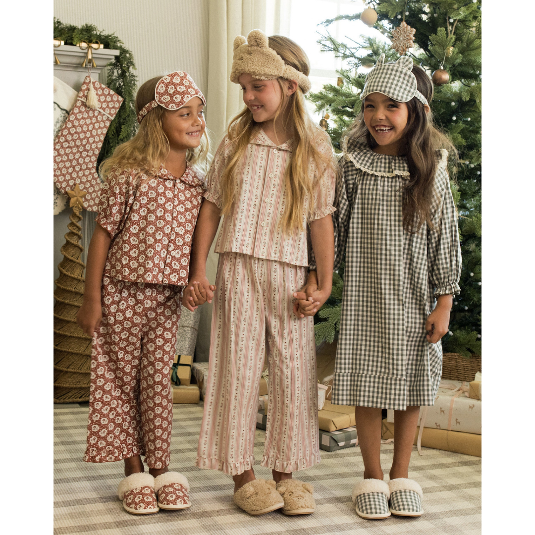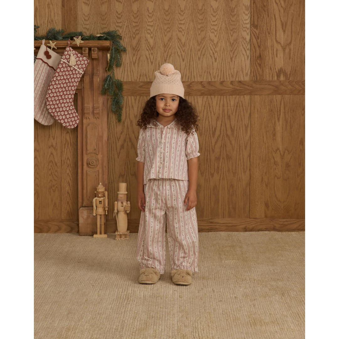 These Ruffle Pajamas are the perfect blend of cute and cozy. This woven pajama set features a charming ruffle-collar top paired with wide-leg pants designed with an elastic waistband for maximum comfort. So soft and stylish, you’ll want to lounge in them all morning long! Featuring a 'candy cane stripe' print on a 'natural' hue.