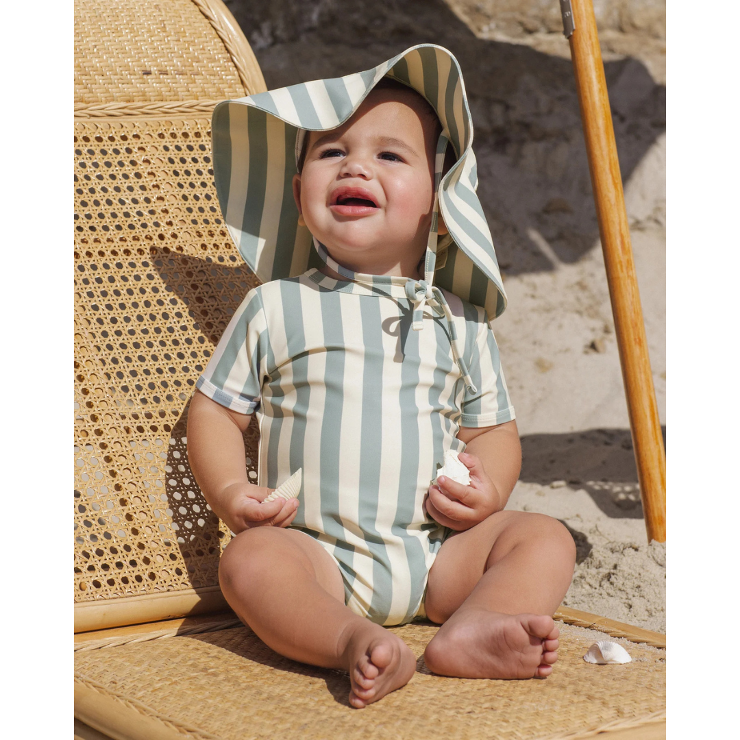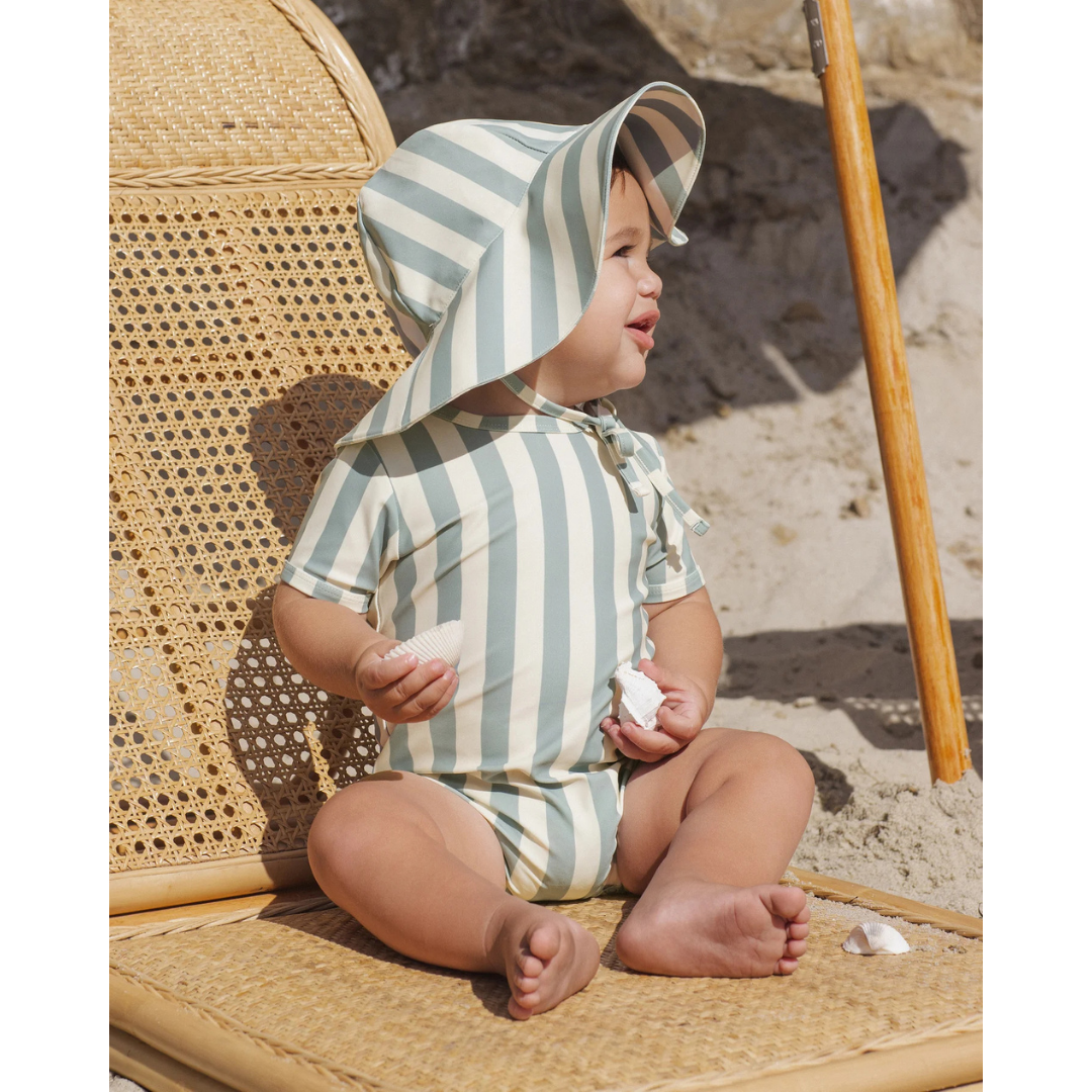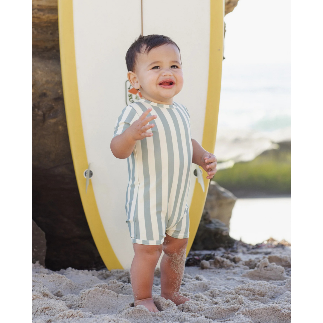 This Shorty One-Piece is an adorable way to keep your little one protected from the sun in style. Zipper closure at the back and snaps at the leg openings for easy changing. Featuring a 'green stripe' all-over pattern.