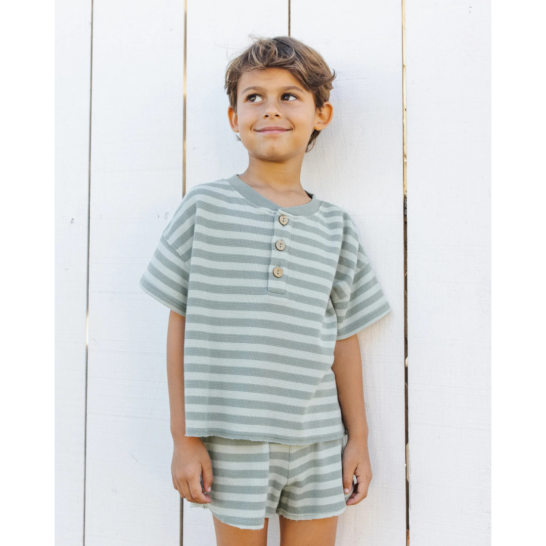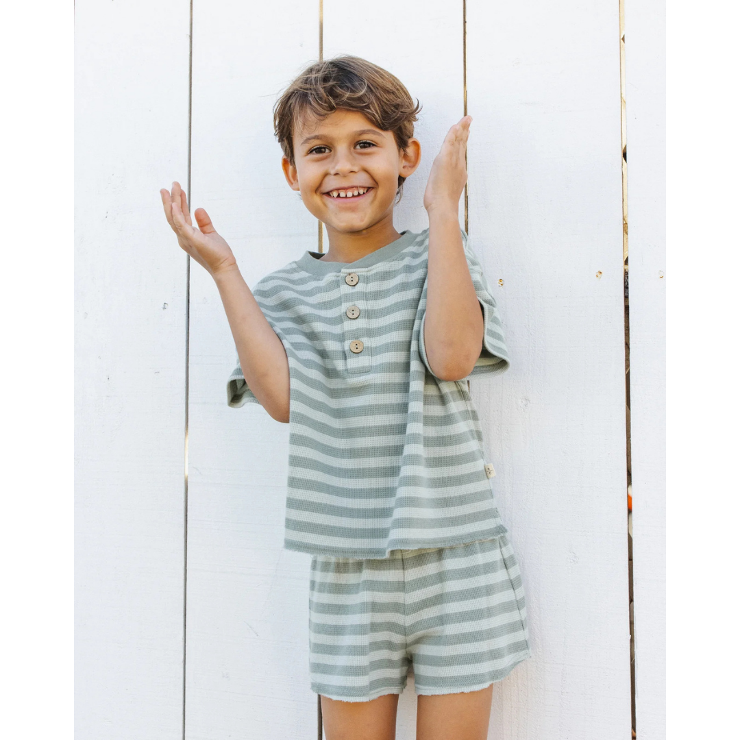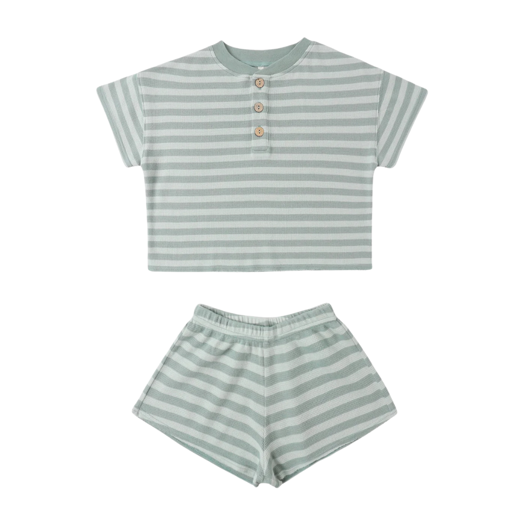 A relaxed fit short sleeve tee with a button placket in the front and a pair of shorts made from soft waffle fabric. Featuring a 'sea green stripe’ all-over pattern.