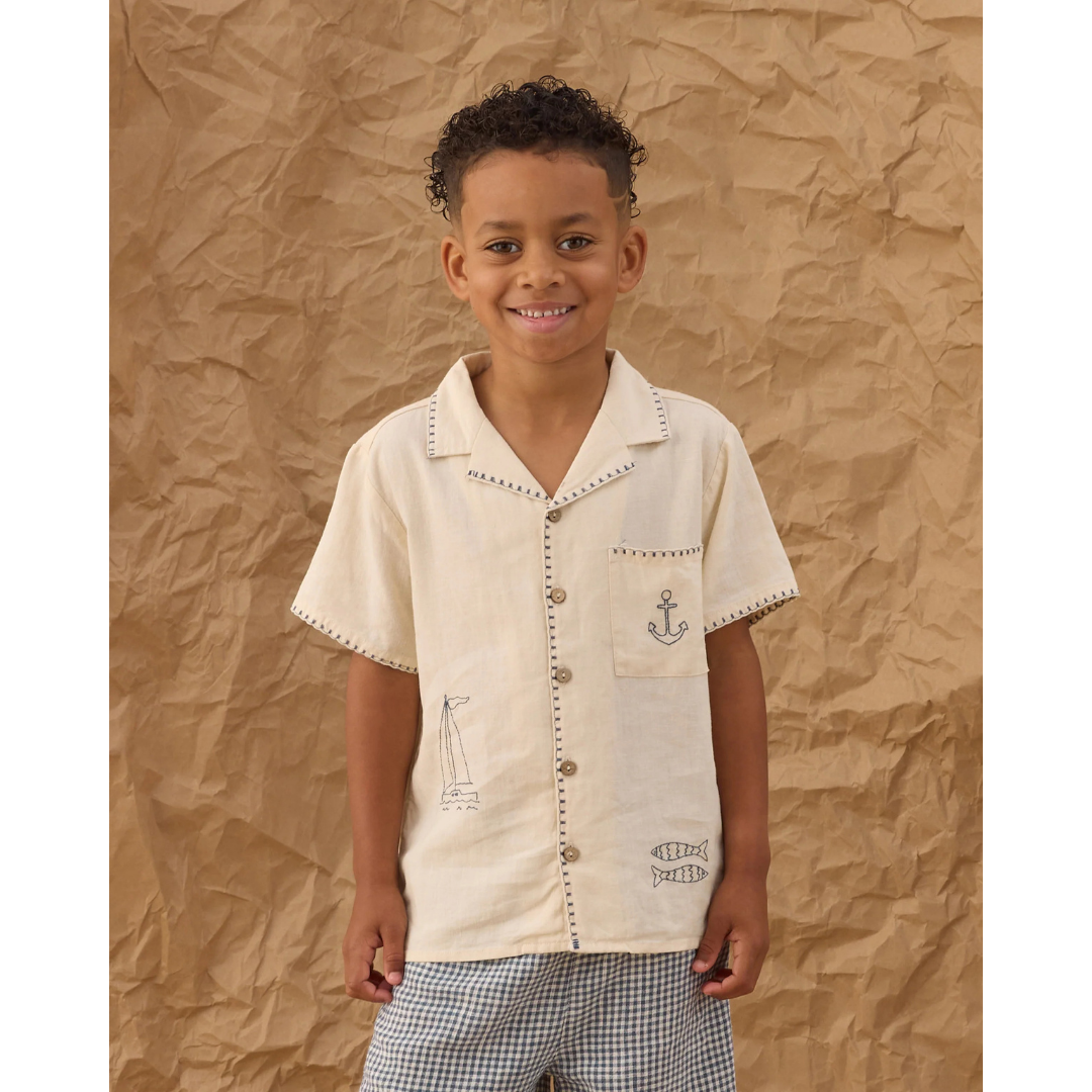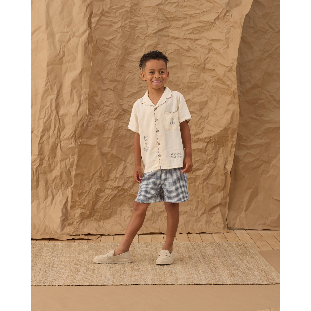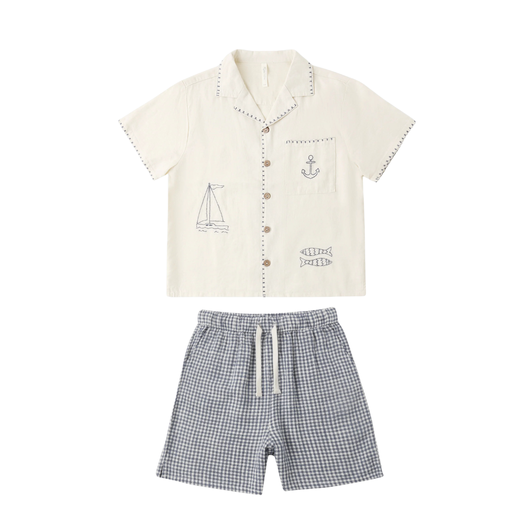Enjoy seaside days in this cool look. The button up shirt features a lapel collar, a chest pocket and sailor embroideries, and the shorts feature side and back pockets and an elastic waistband with a functional drawstring.