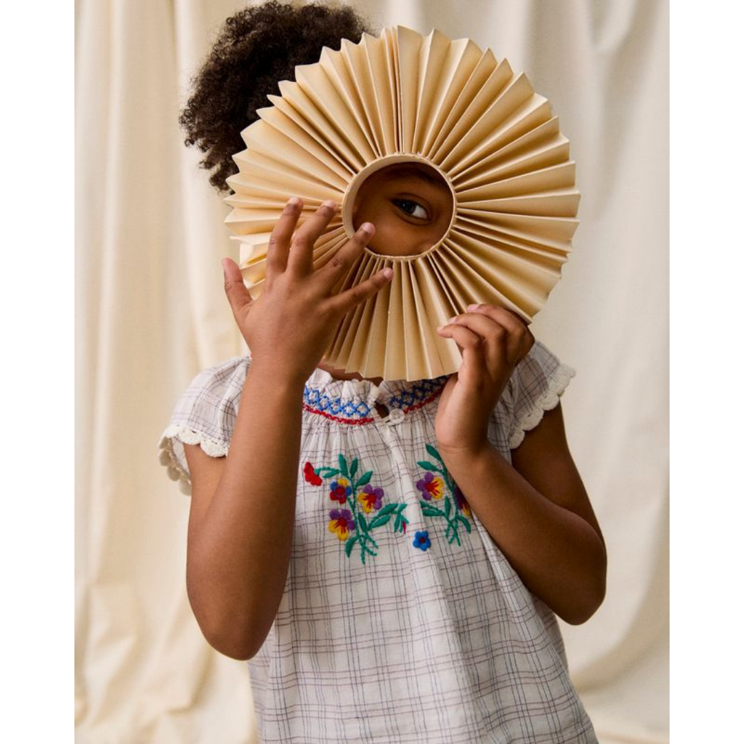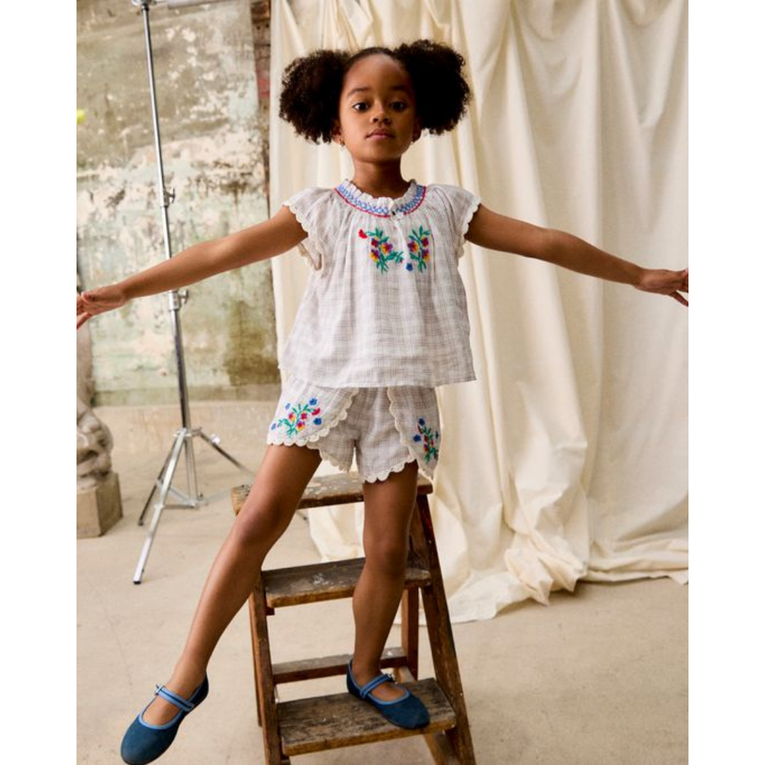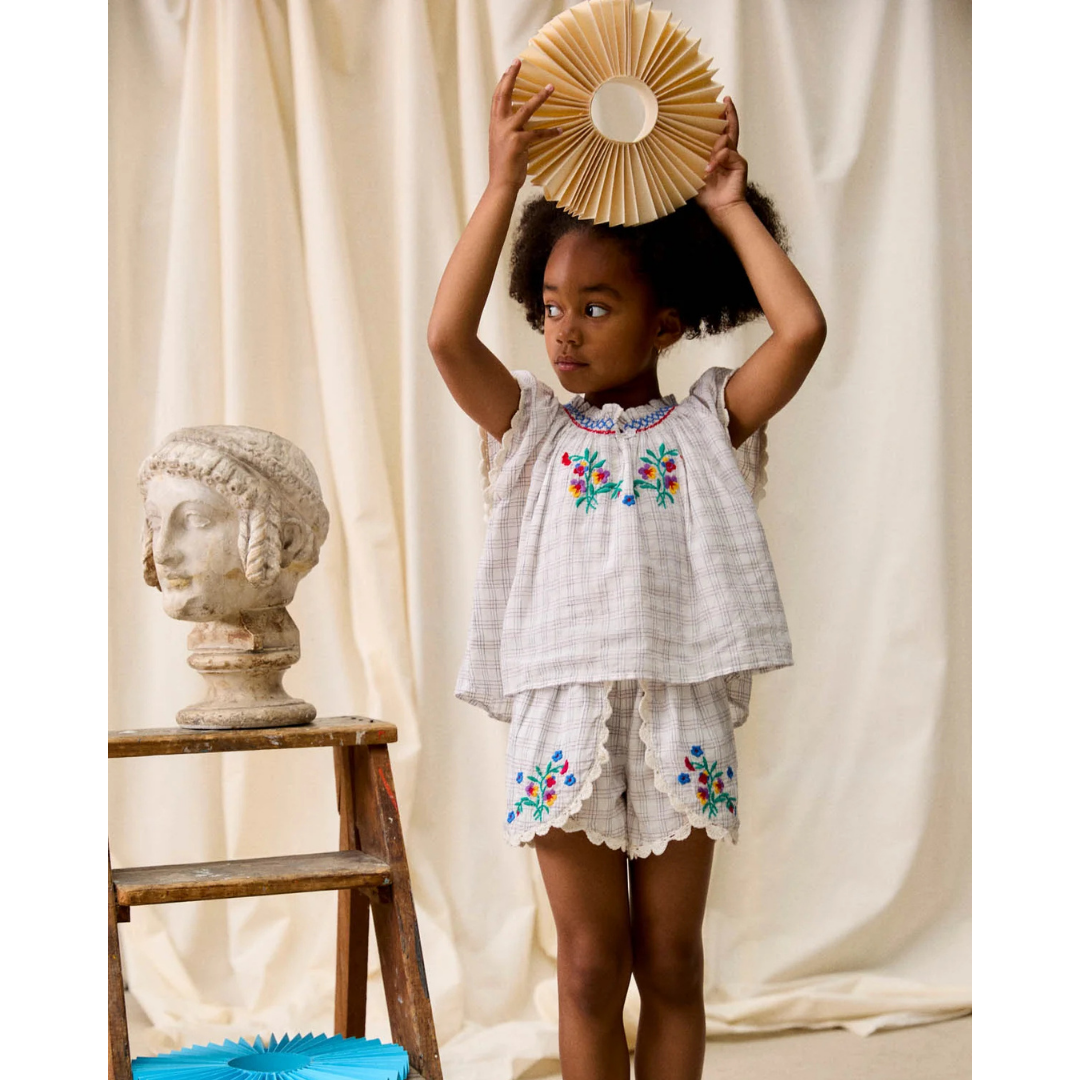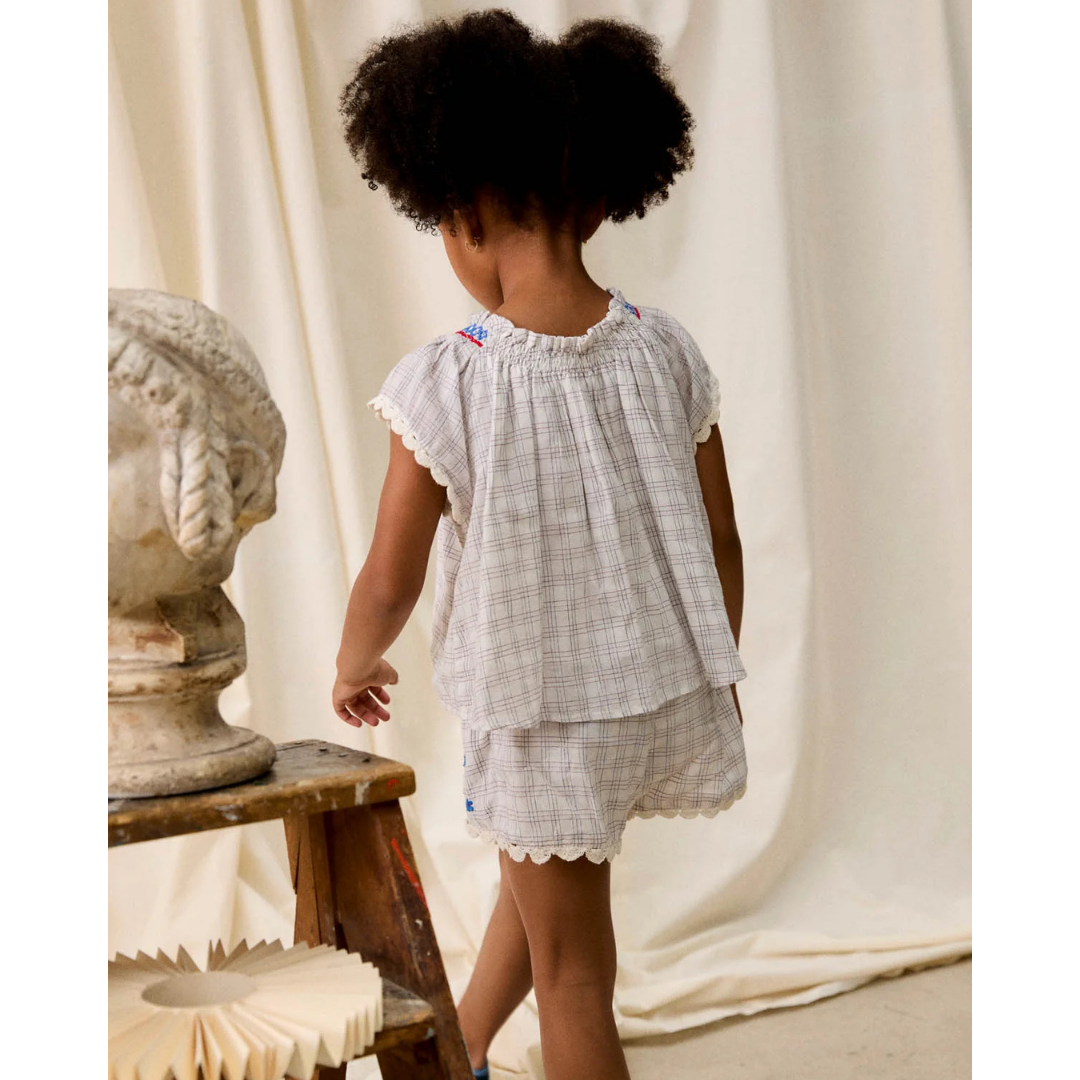Yarn-dyed cotton checkered set. The blouse features cross-stitched embroideries at the neckline, an embroidered floral motif on the chest, and scalloped lace edges at the bottom hem and sleeves. The shorts feature an elasticized waistband at the back, overlapping front panels adorned with embroidered details and scalloped lace edges.