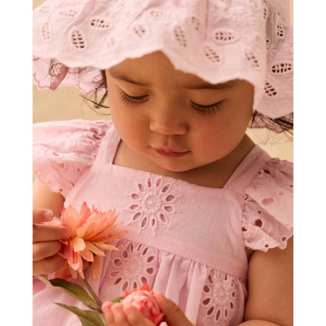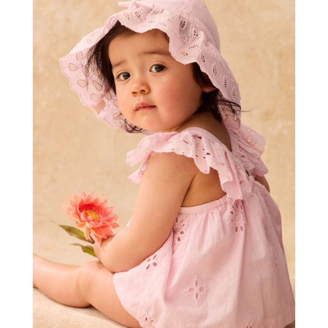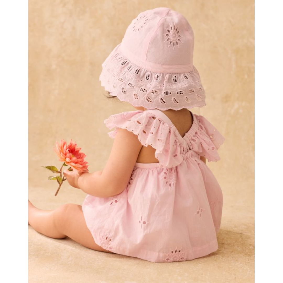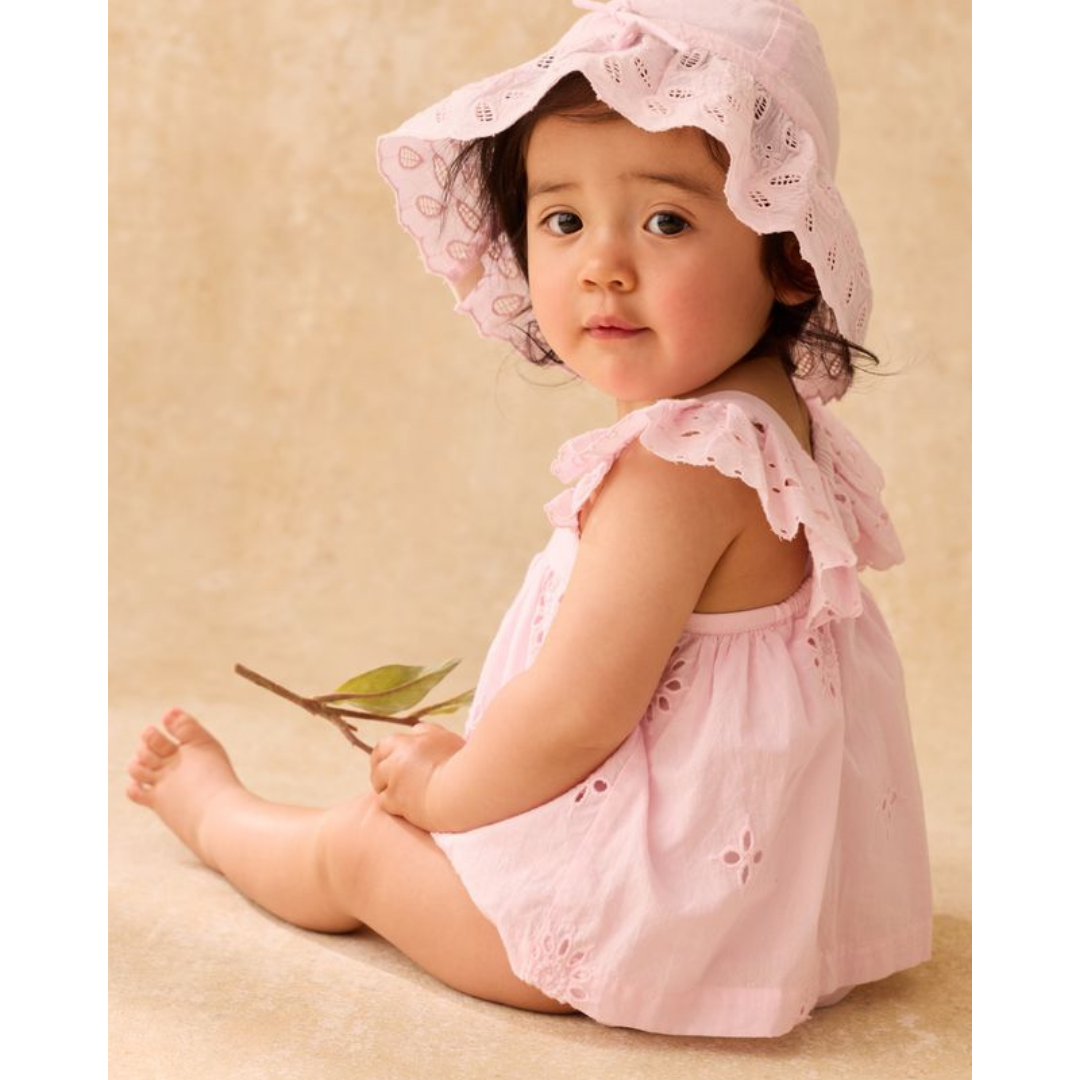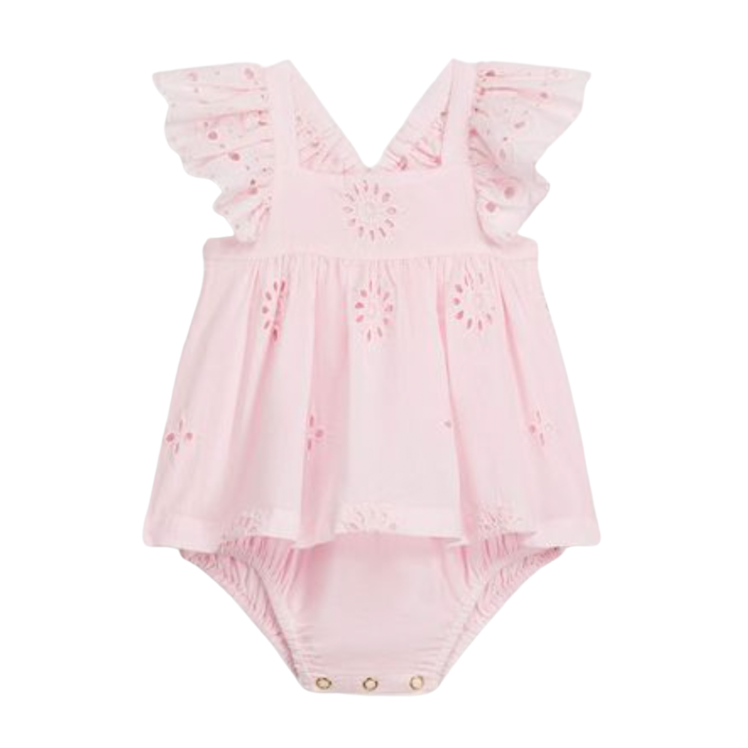 Dress-style romper designed with ruffled, eyelet straps that cross at the back, eyelet details throughout, elasticated thighs, and crotch snap opening.