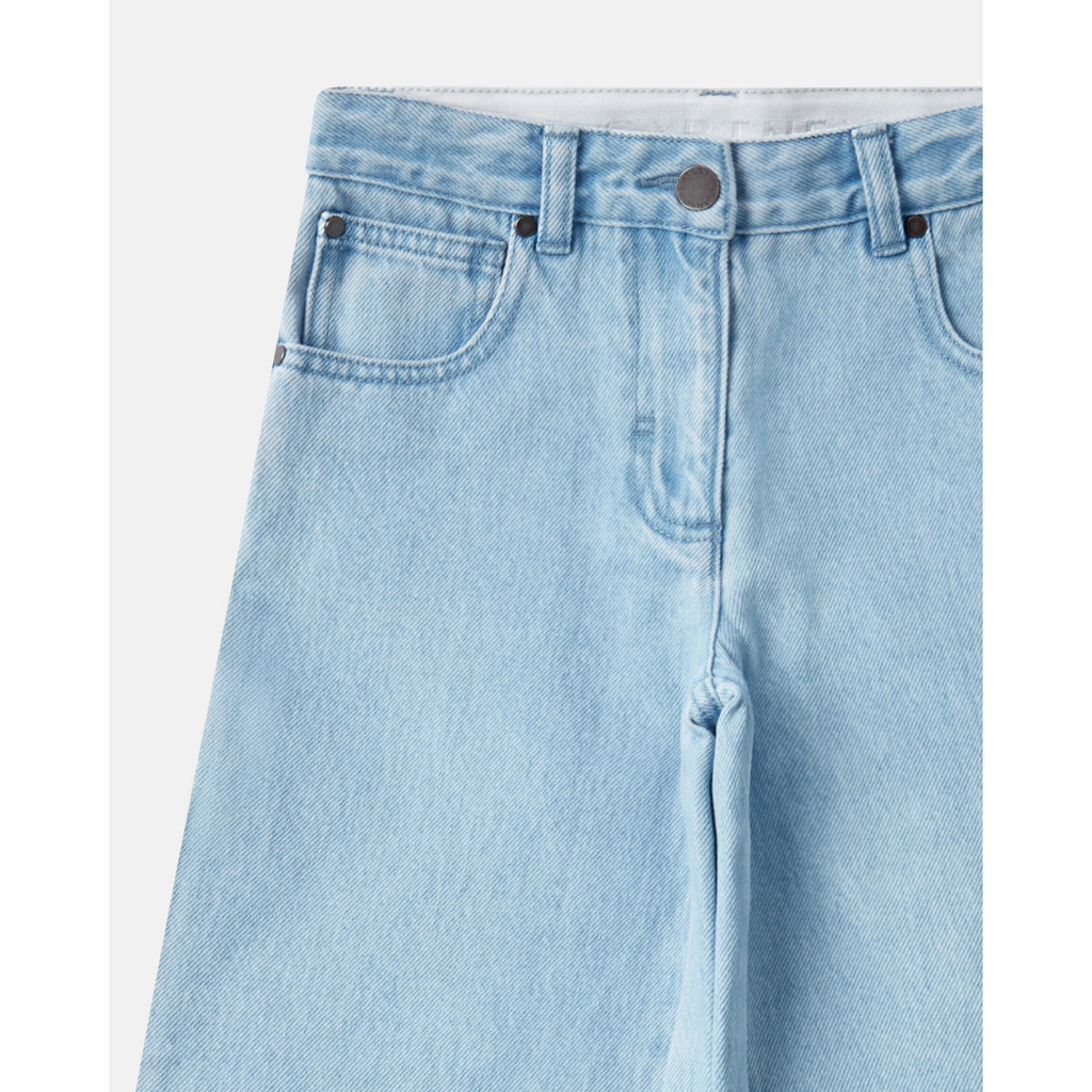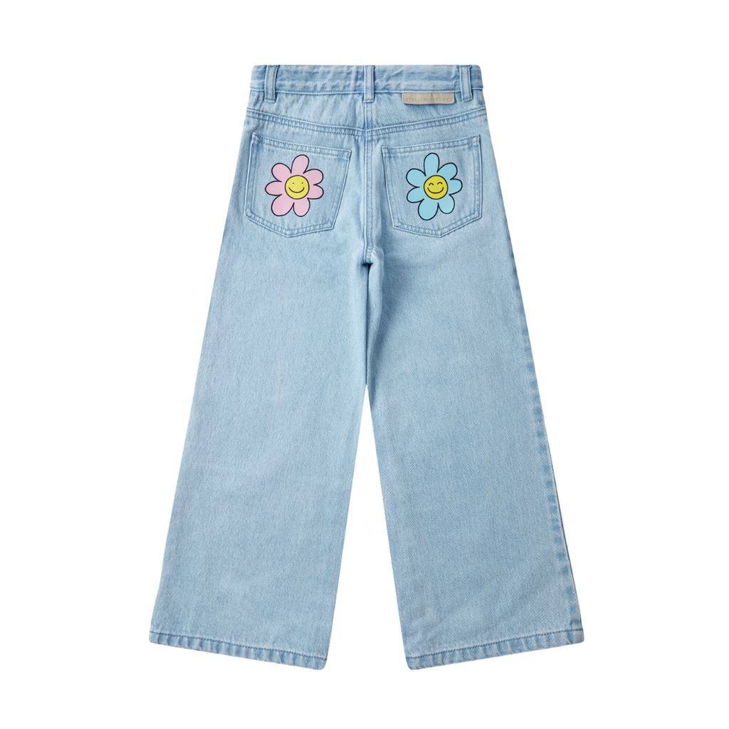 These jeans are made from soft organic cotton denim. For Fall/Winter 2025, Stella McCartney Kids is inspired by the love we have for our one shared home – Mother Earth. Smiling flowers, hearts and other earthy friends beam across a collection crafted from 96% conscious materials. The jeans are a mid-rise and wide-leg fit.