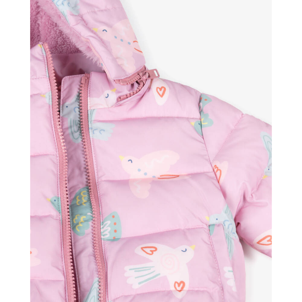 A love for animals can take wing at any age. This puffer coat is made from recycled materials and printed with soaring doves. The puffer is hooded, padded and zips in the front.