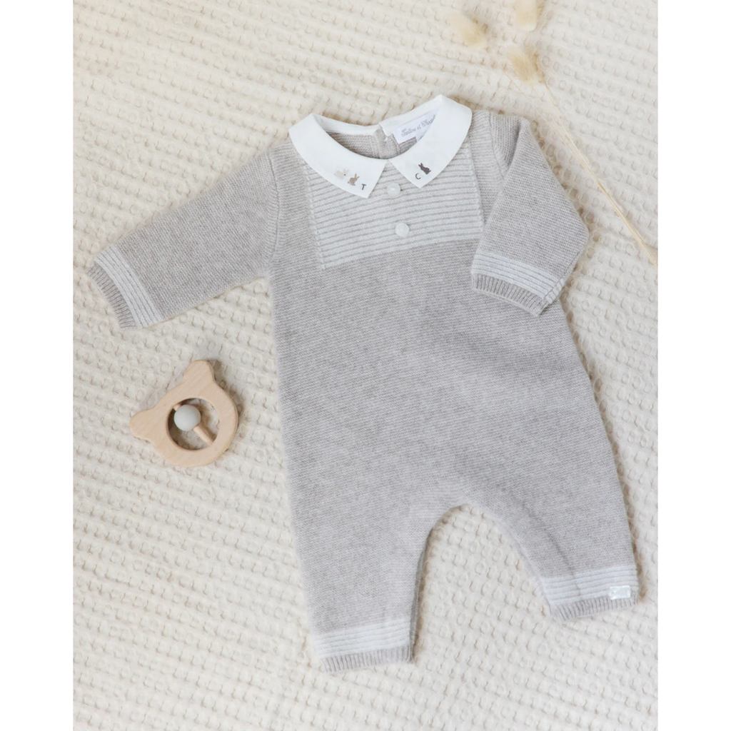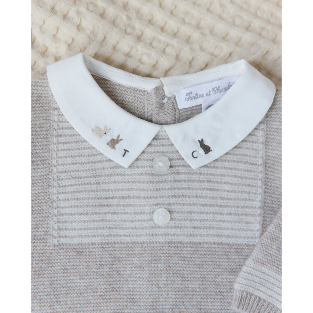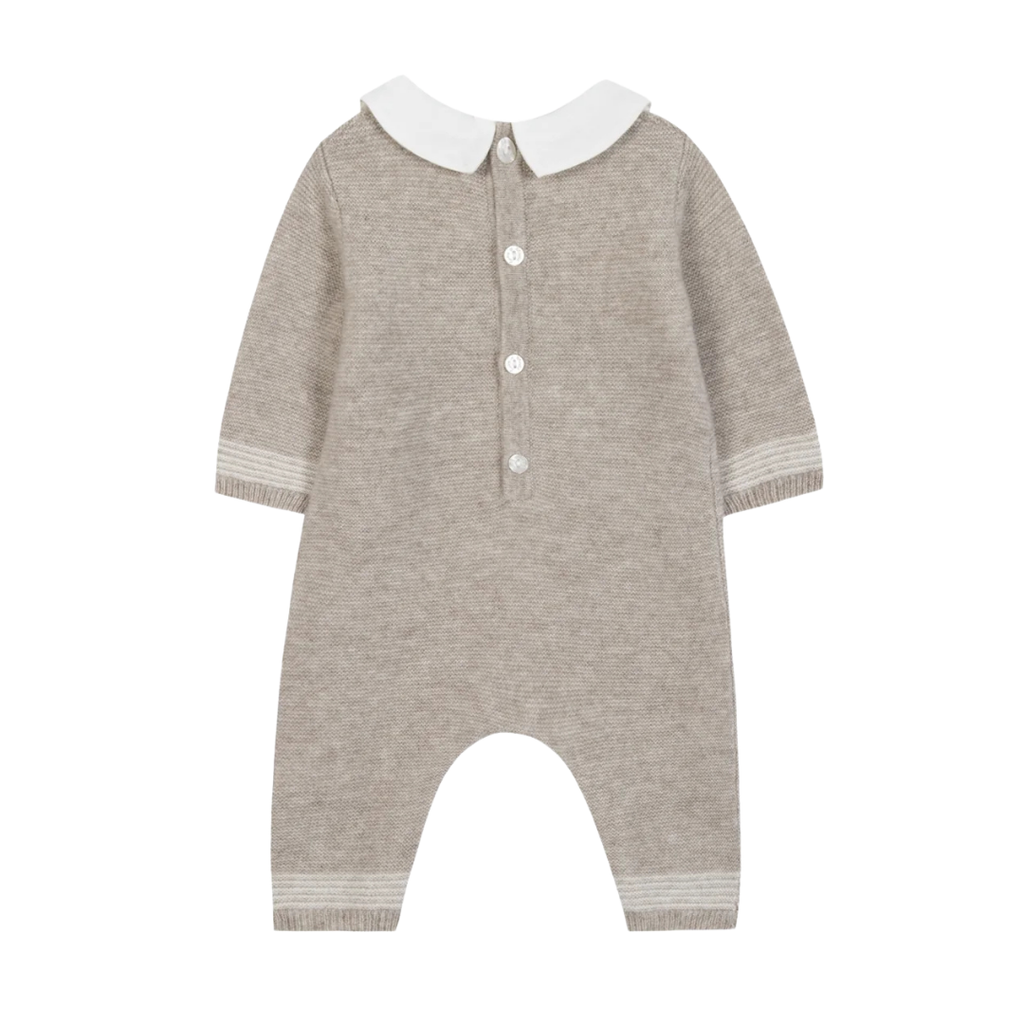 This longall in hunched grey features a pointed collar with delicate embroideries and smocked knitting that adds a refined and elegant touch to this piece. Perfect for the first moments with softness and style.