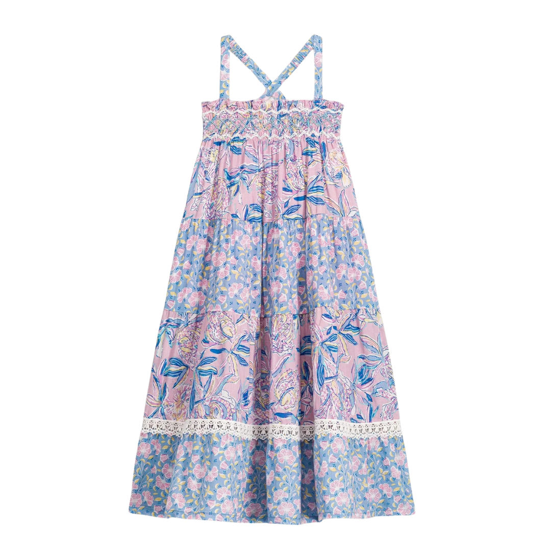 Long floral cotton veil dress with hand-embroidered smocks on the top, adjustable, elasticated straps that cross at the back and a large frieze-style ruffle at the bottom.